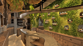 Custom display niches and the green wall with suspended mushroom-like shelves.